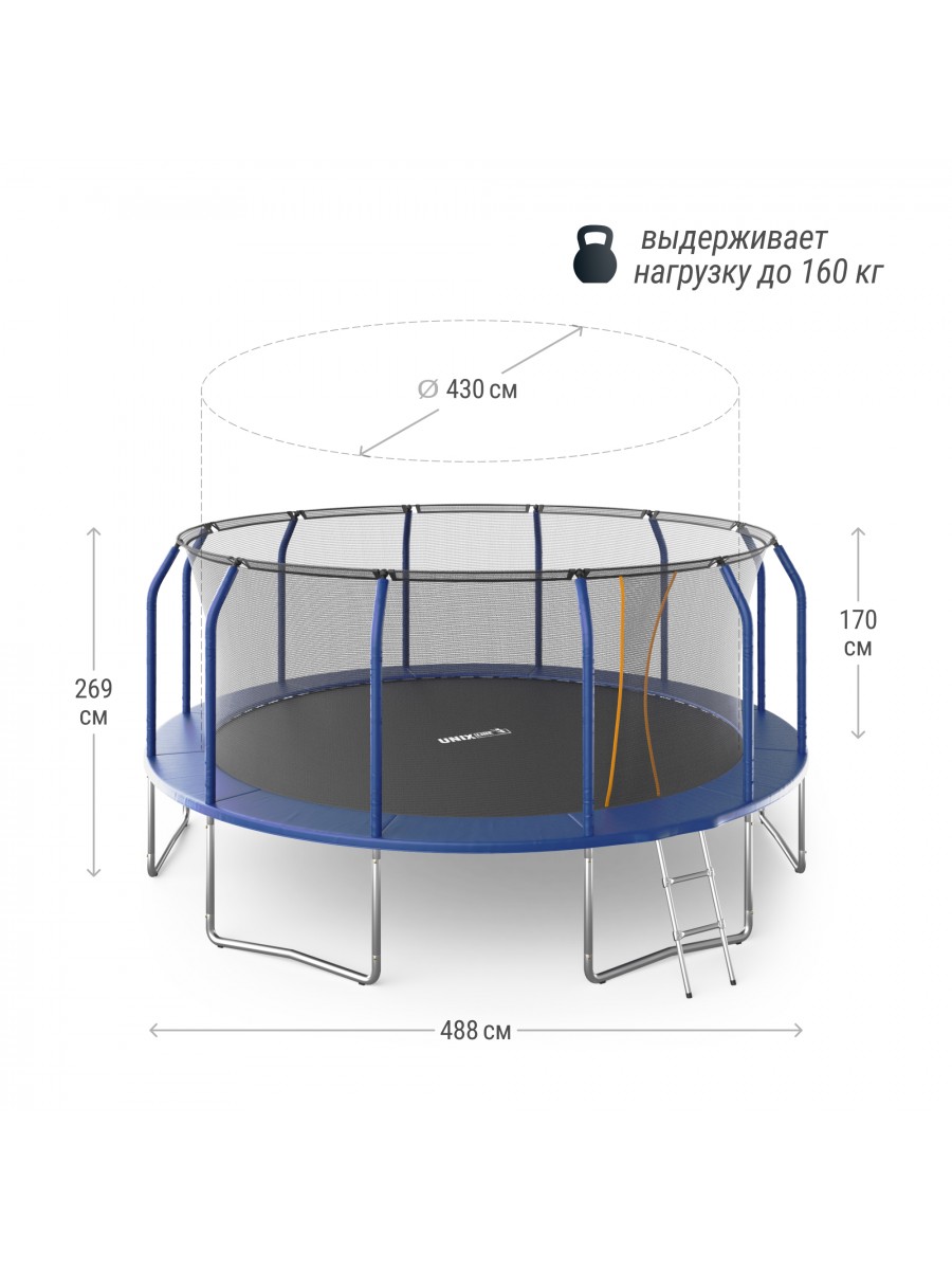 Кроме того, батут обладает высокой устойчивостью к внешним погодным условиям. Он не боится солнечных лучей, дождя и низких температур, что позволяет оставлять его на улице круглый год. Это экономит пространство в доме и время на установку/демонтаж. Батут UNIX Line SUPREME BASIC 16 ft – это залог активного и веселого отдыха для всей семьи!