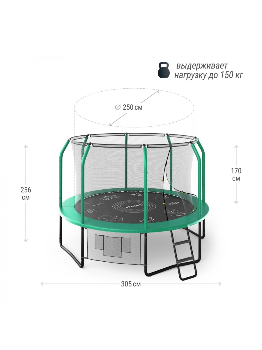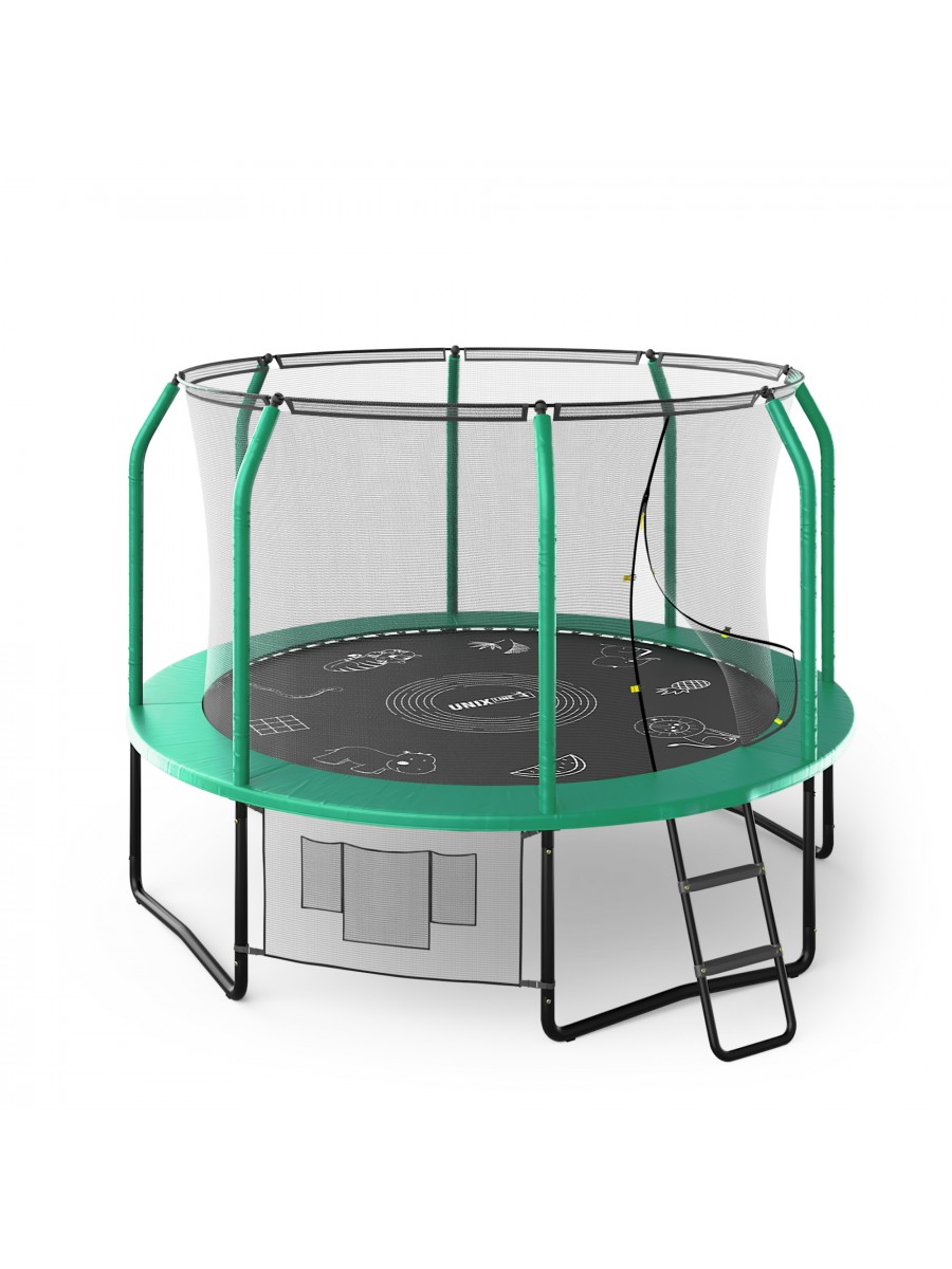 Помимо верхней защитной сетки, все батуты премиального модельного ряда UNIX line оборудованы карманом для обуви и лестницей для удобства пользования.
