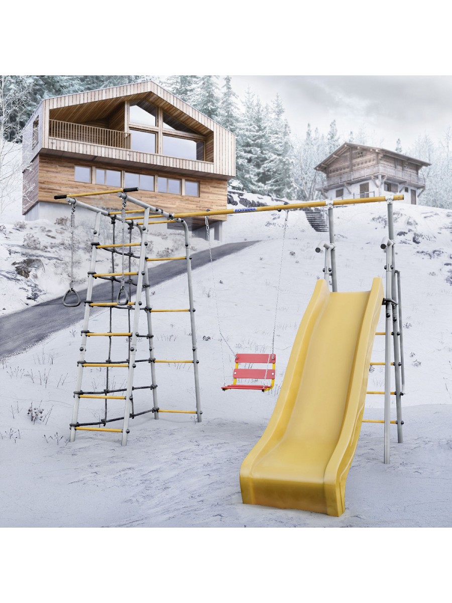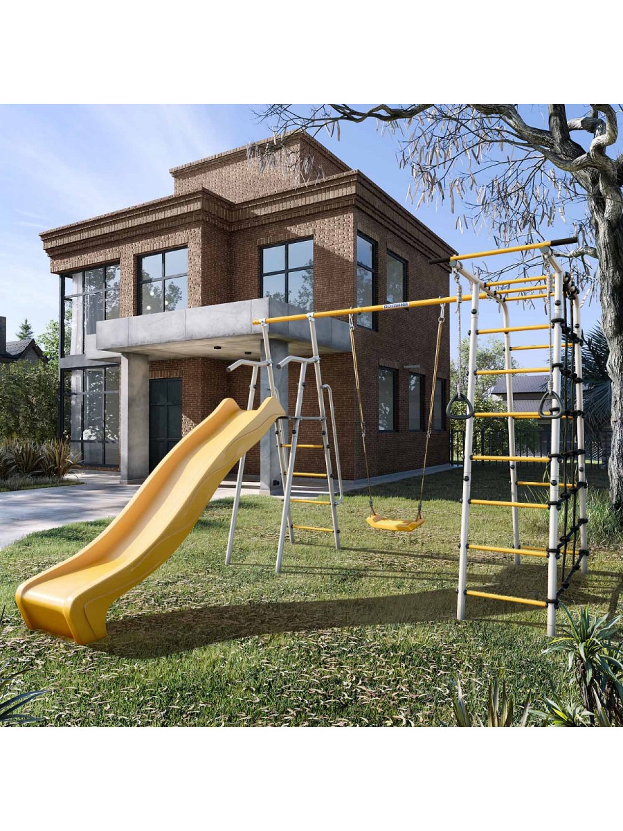 В дачном комплексе предусмотрена удобная и безопасная горка, рядом с которой располагаются качели. Другая часть комплекса состоит из лестницы и турника, а также канатного лаза, сделанного из шнура повышенной прочности. В комплекте также предусмотрены гимнастические кольца. Все навесное оборудование выполнено из атмосферостойких материалов — в летнее время их можно не убирать в дом после занятий.