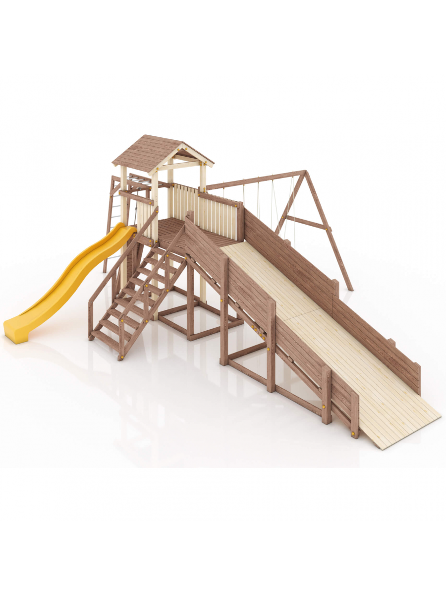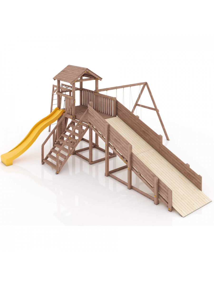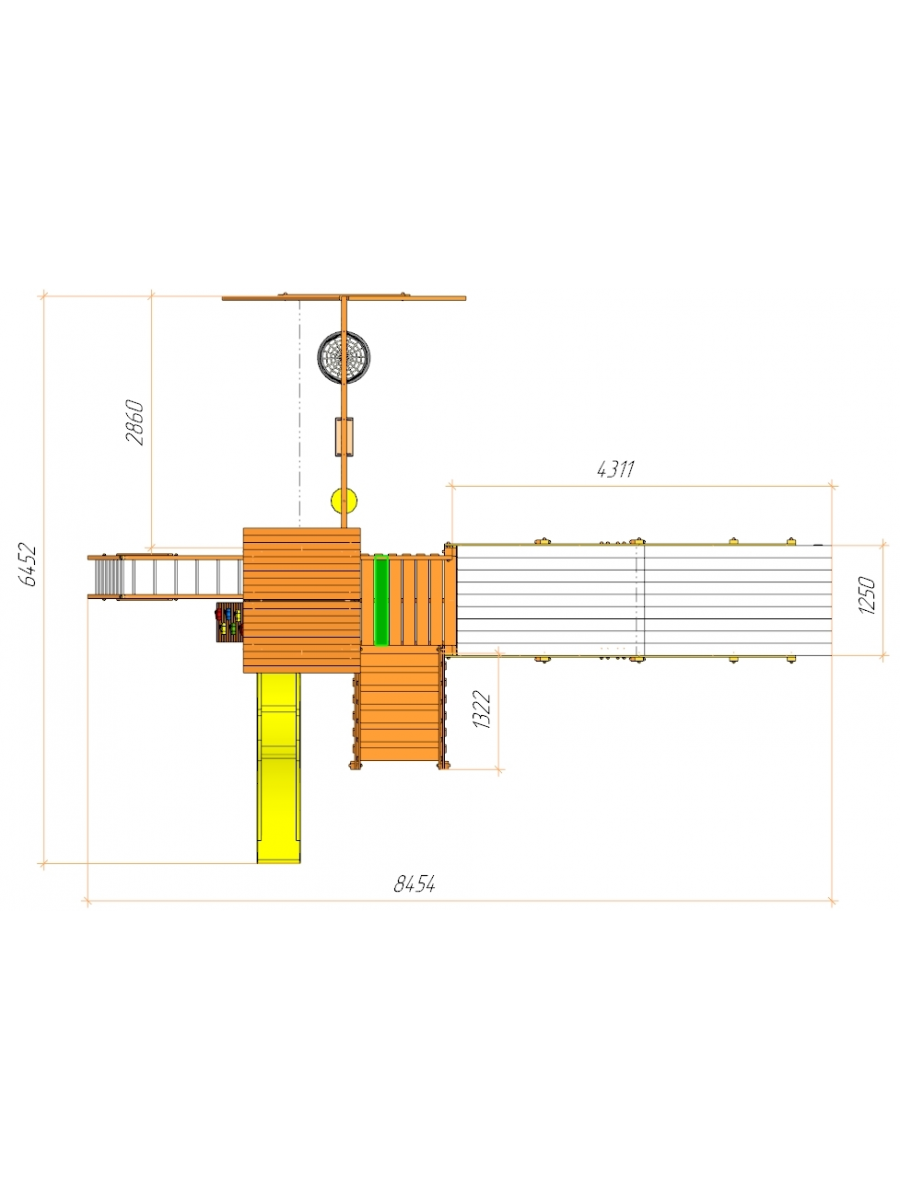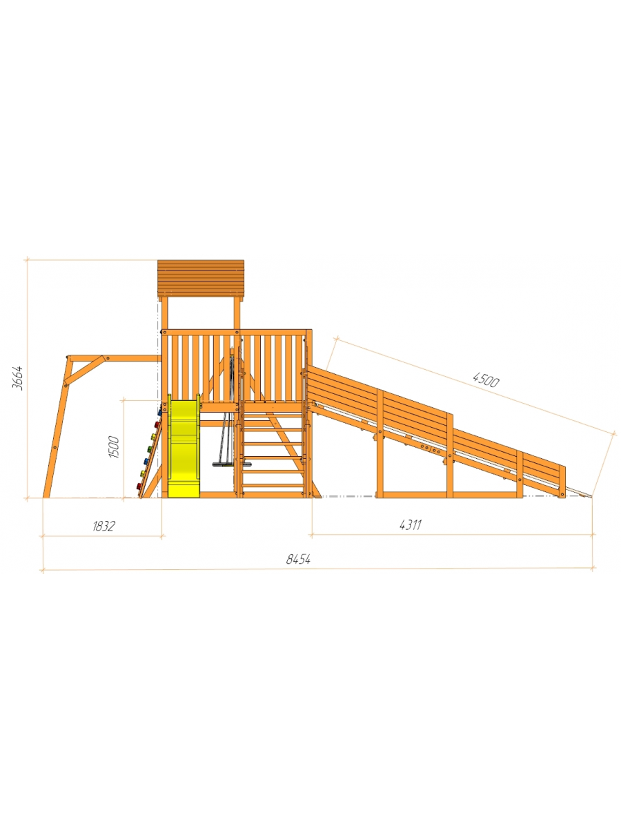 | Внешние размеры площадки8450 мм х 6450 мм | Высота 3660 мм | Высота качелей2300 мм |