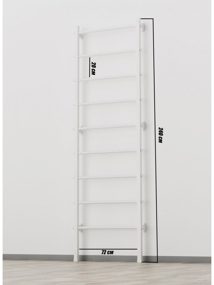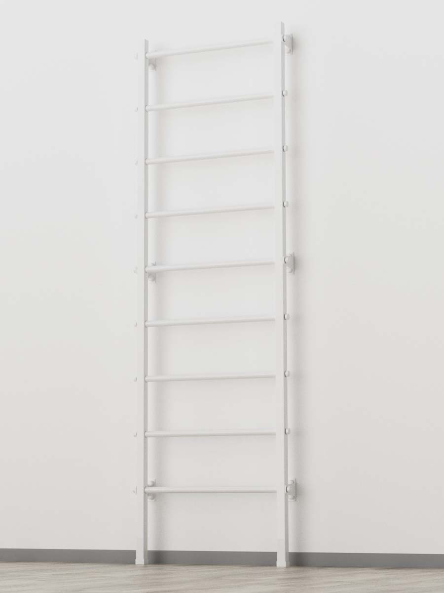 Стали для шведской стенки премиум-класса обработаны специальным белым покрытием, которое обеспечивает высокую коррозионную стойкость и долговечность. Опоры на пол дополняют конструкцию, обеспечивая надежность и устойчивость.