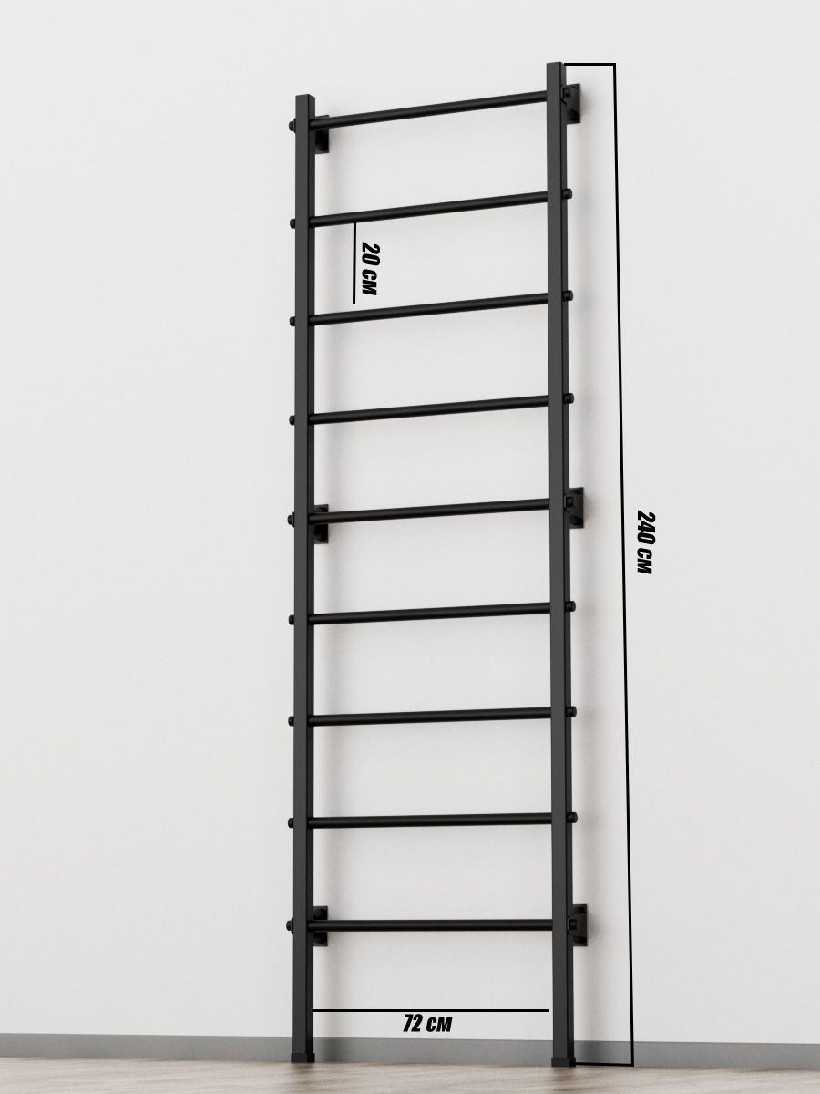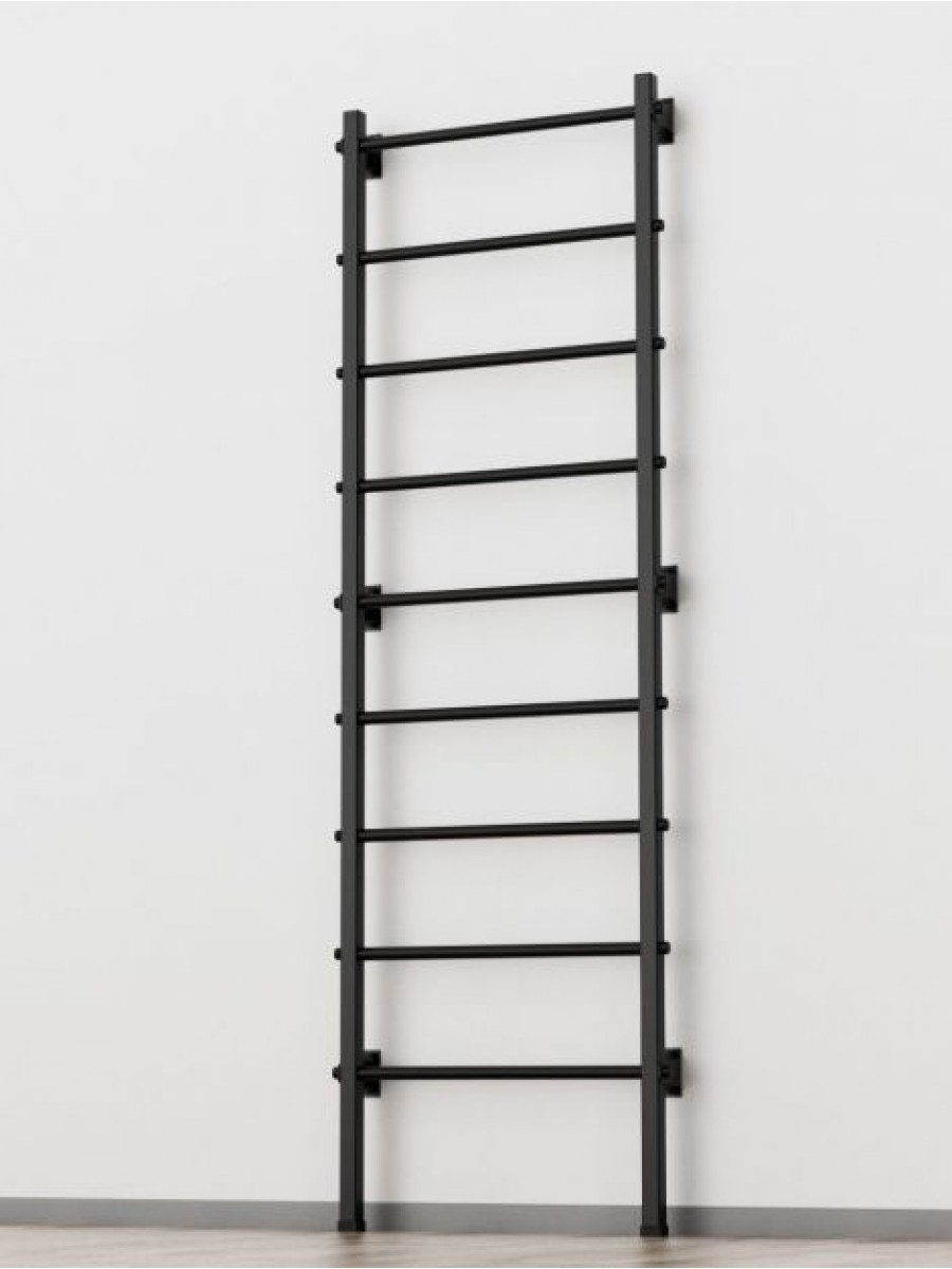 Стали для шведской стенки премиум-класса обработаны специальным черным покрытием, которое обеспечивает высокую коррозионную стойкость и долговечность. Опоры на пол дополняют конструкцию, обеспечивая надежность и устойчивость.