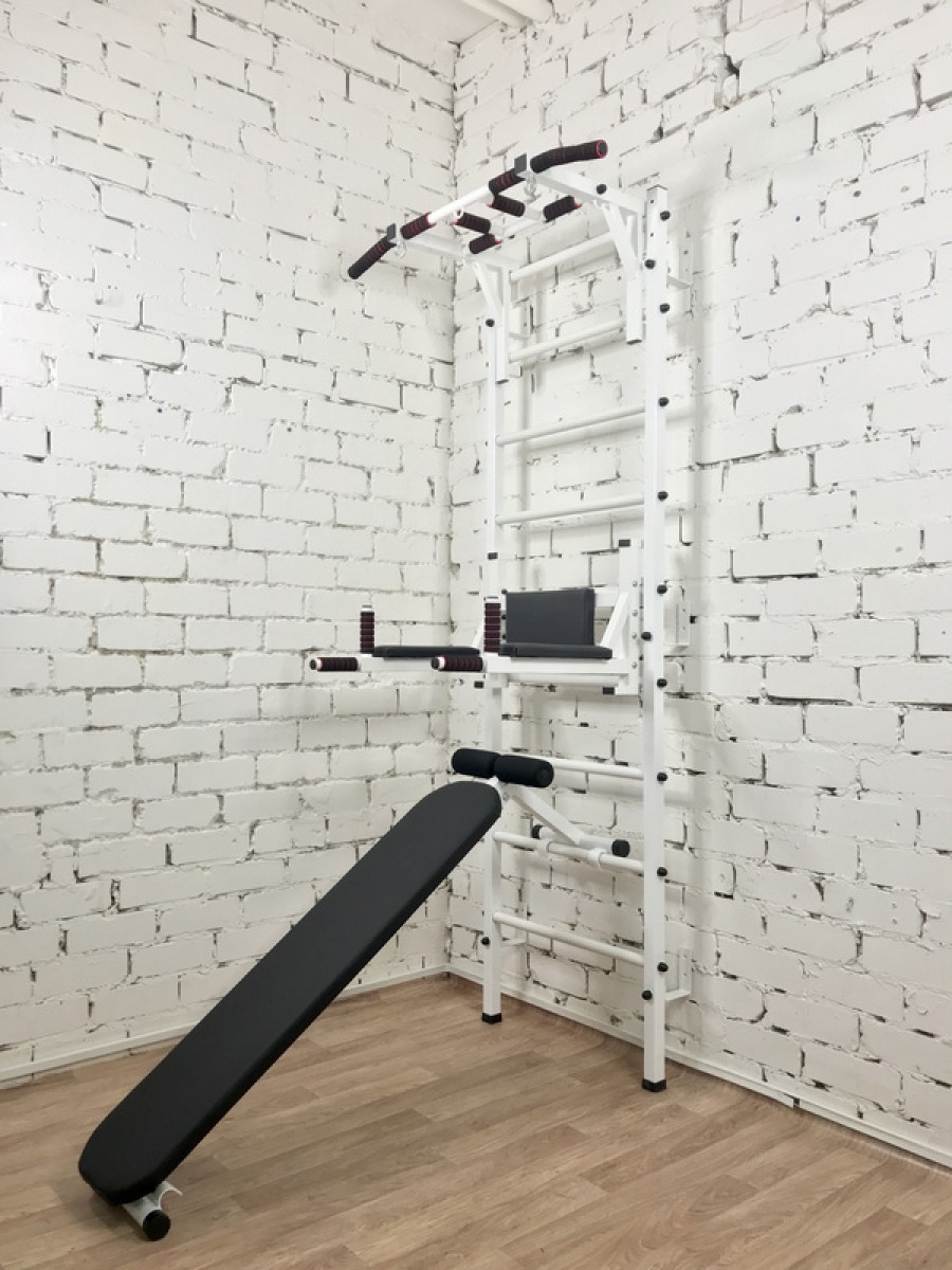 В комплект входит: гимнастическая лестница, турник 3 хвата, брусья-пресс и скамья для жима/пресса.